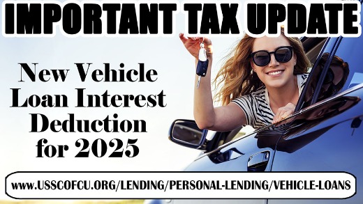 Under the One Big Beautiful Bill Act, the IRS now allows eligible taxpayers to deduct up to $10,000 per year in interest paid on qualified vehicle loans for new personal-use vehicles purchased in 2025 through 2028. We encourage you to consult with a tax professional to determine your eligibility and ensure proper documentation. If you have questions about your loan or the information we’ll provide, please contact your local USSCO Federal Credit Union branch location.