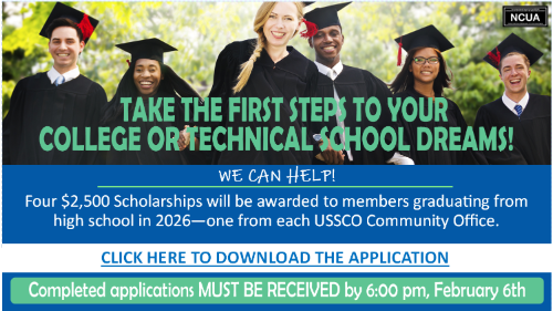TAKE THE FIRST STEPS TO YOUR COLLEGE OR TECHNICAL SCHOOL DREAMS! Four $2,500 Scholarships will be awarded to members graduating from high school in 2025—one from each USSCO Community Office. Completed applications MUST BE RECEIVED by 6:00 pm, February 6th.
